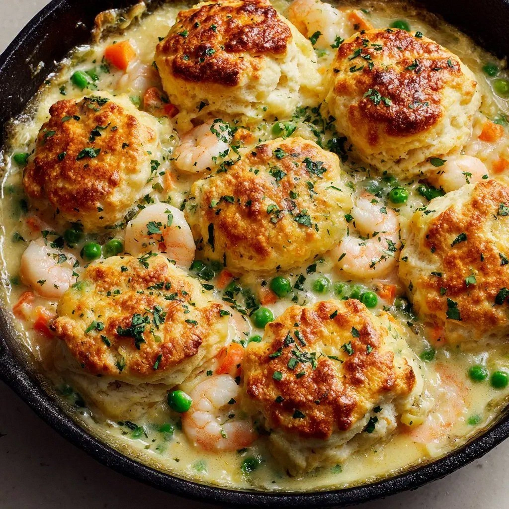- When the biscuits are ready, spoon the hot seafood filling into a large baking dish, then top with the biscuit dough. Press the biscuits gently into the filling so they adhere, then bake the assembled pie at 375°F (190°C) for 20 to 25 minutes. The biscuits will rise and brown, creating a beautiful, golden crust.